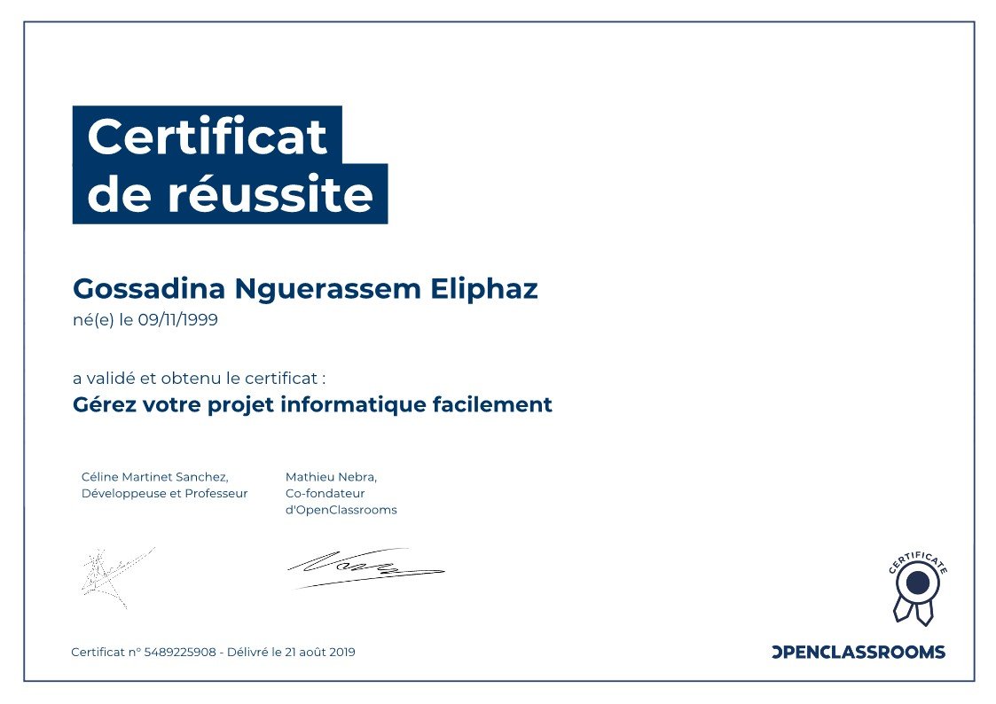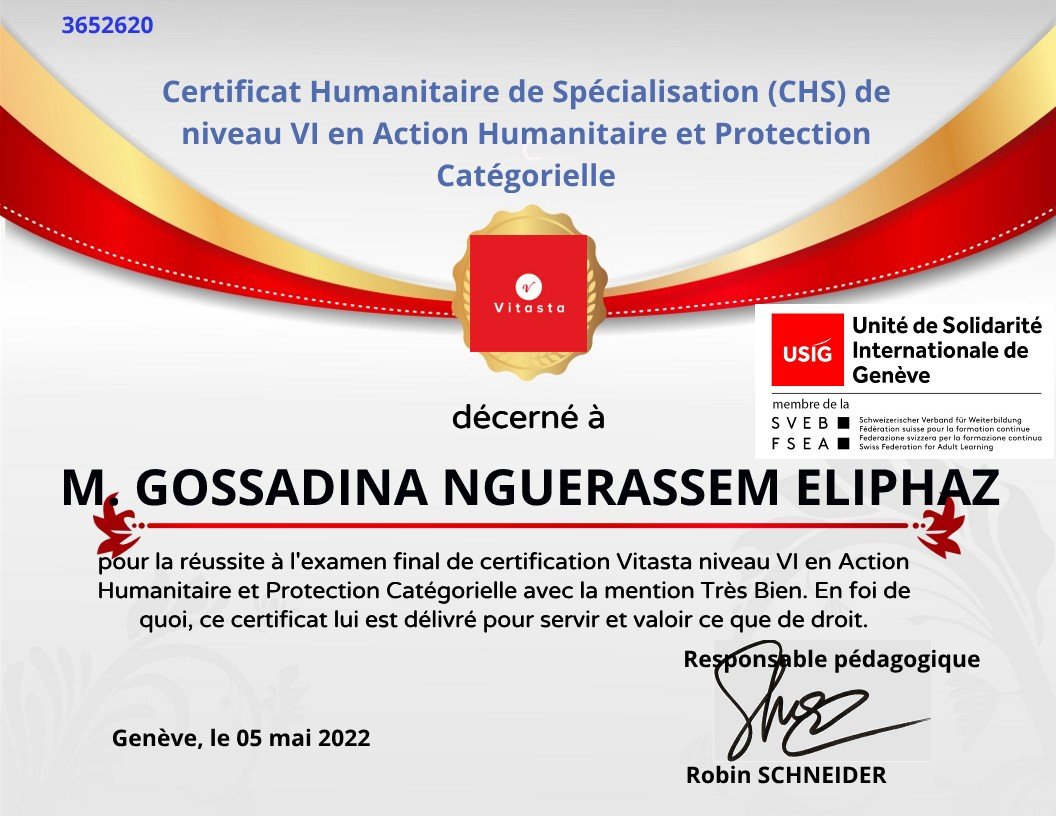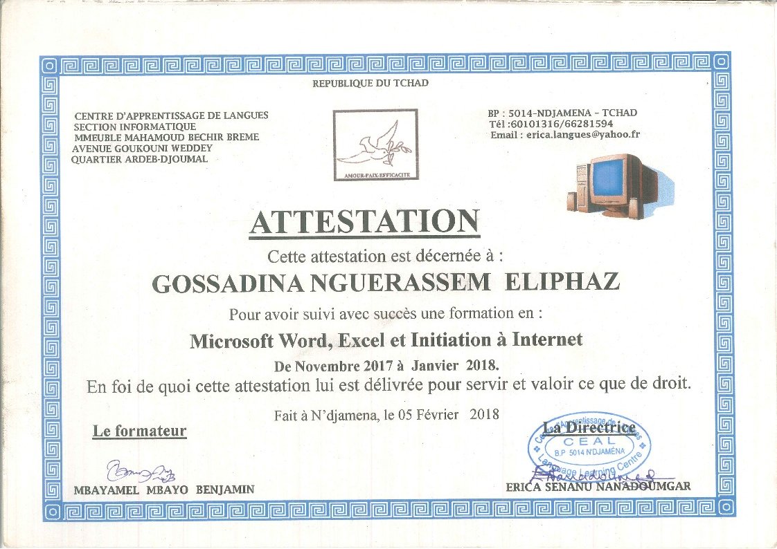 Je suis GOSSADINA NGUERASSEM Eliphaz, de nationalité tchadienne. Etudiant en dernière année de Master 2 en Management et Administration des Entreprises – parcours Management Général, et titulaire d’un diplôme d’Ingénieur en Informatique.