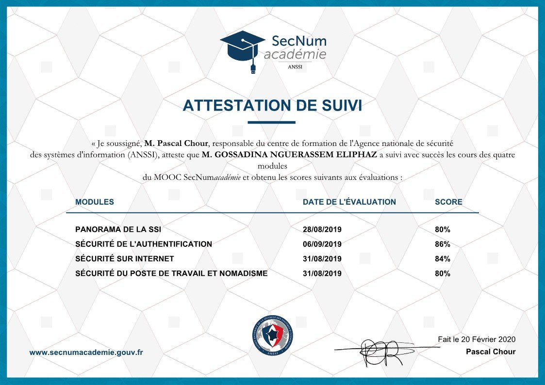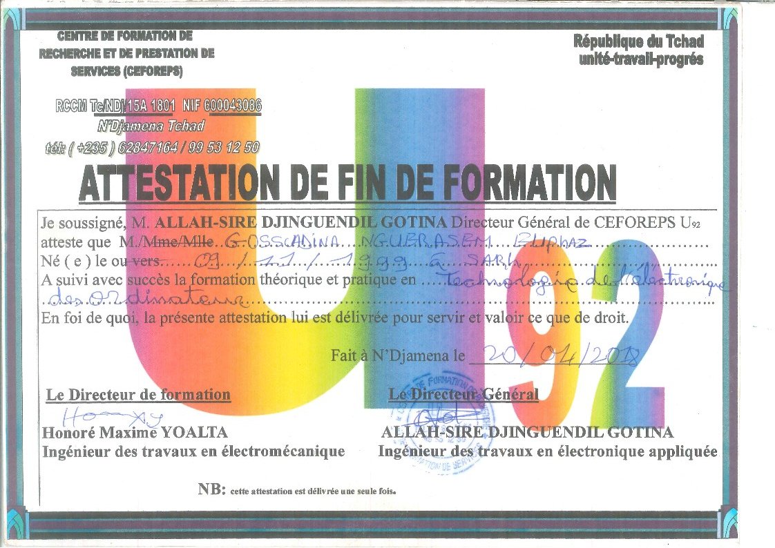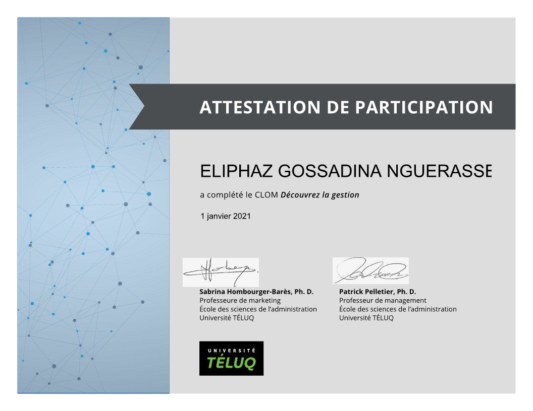 Je suis GOSSADINA NGUERASSEM Eliphaz, de nationalité tchadienne. Etudiant en dernière année de Master 2 en Management et Administration des Entreprises – parcours Management Général, et titulaire d’un diplôme d’Ingénieur en Informatique.